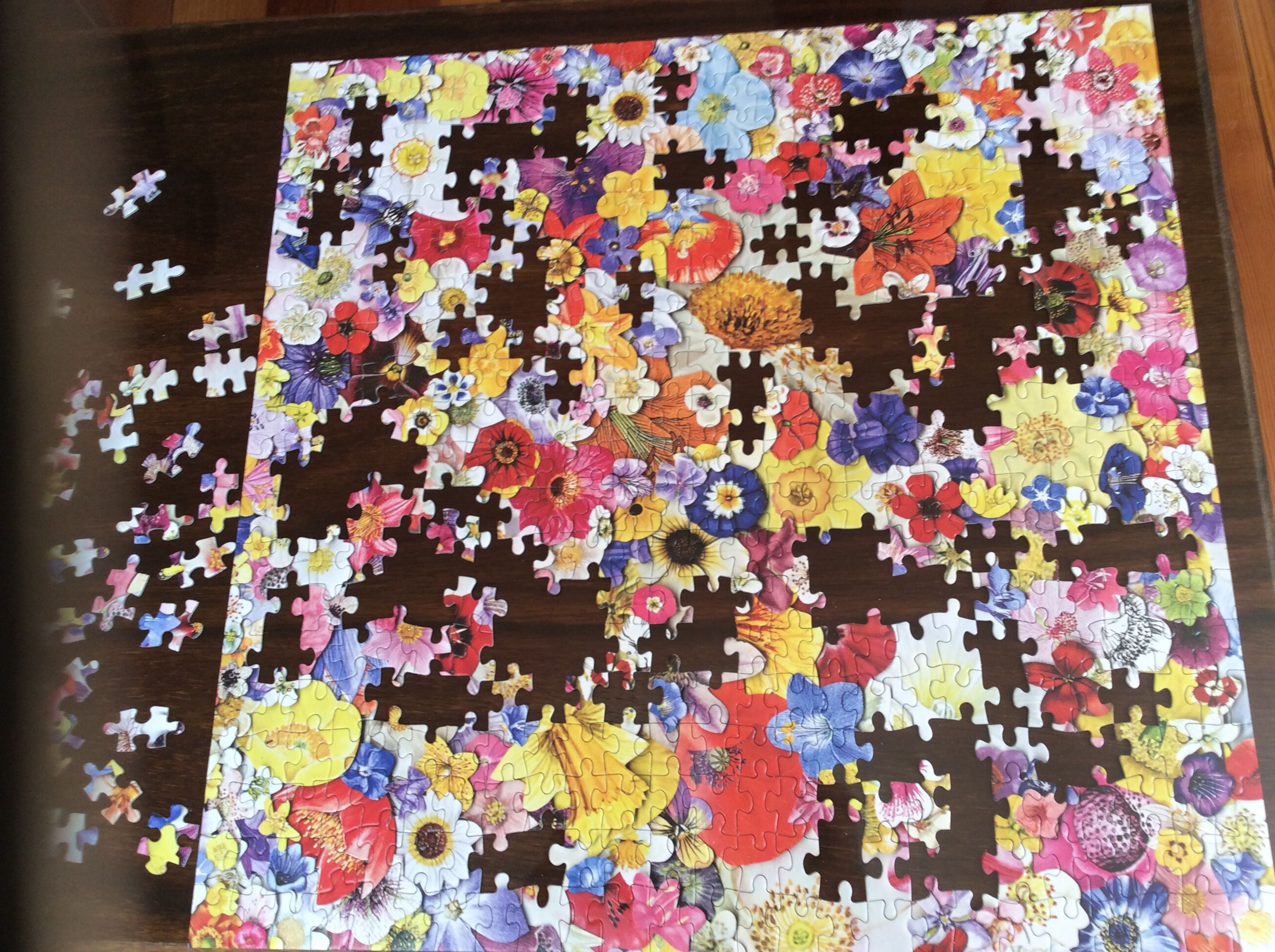 The puzzle has no natural up and down, no ceiling or floor, no sky or ground, no natural framing, just blossoms. Sometimes I look at one puzzle piece, then examine the picture, looking for a distinctive feature of the piece, for example, a bright bit of orange or the tiny stamens from the center of a bloom. This allows me to place it in the general vicinity where it belongs. I have no idea why this is so satisfying, but it is.