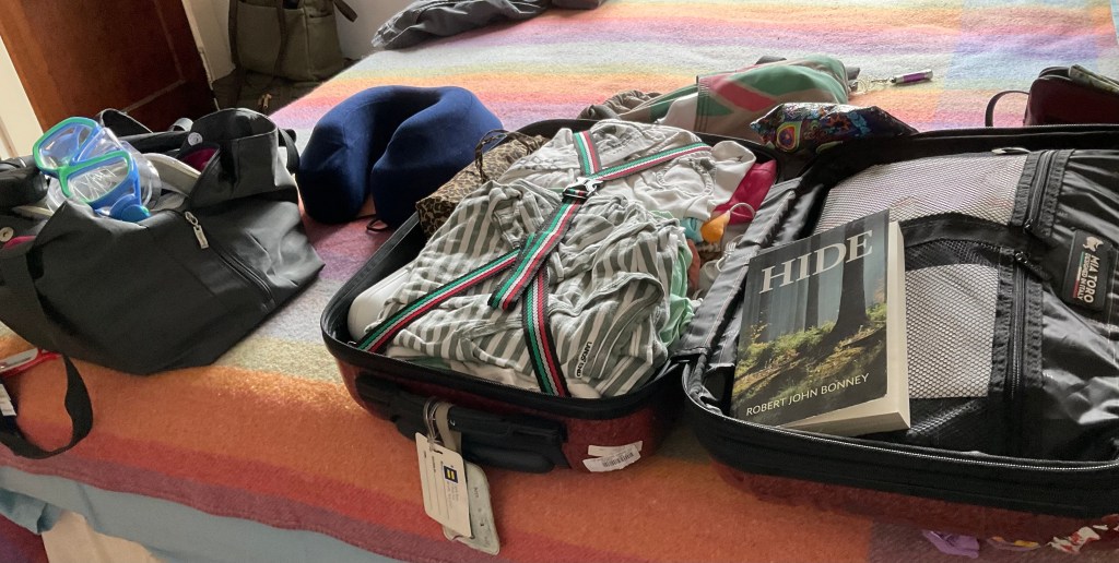 I have packed carefully and lightly, with only a carryon as my checked luggage. My actual carryon holds a snorkel and mask, with shorts and a tee shirt. If they lose my luggage, I can still snorkel in that tropical paradise! I’m taking with me a book written by my climate-protester friend, Hide, fiction that involves concern for the earth. After reading the first twenty pages, I decided that I needed to take it with me for plane-reading.
