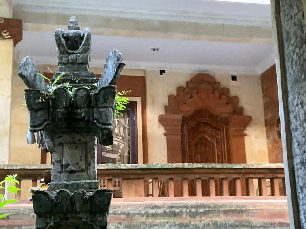 In Ubud, we stayed in a guesthouse (Sania’s), very old, with misshapen stone stairways, worn over generations, with beautifully carved doorways and intricately carved furniture, where we sat for our breakfast. As an aside, we chose each day between the typical Indonesian breakfast of fried rice or Western options of eggs or pancakes, each served with a fresh fruit platter and coffee or tea.